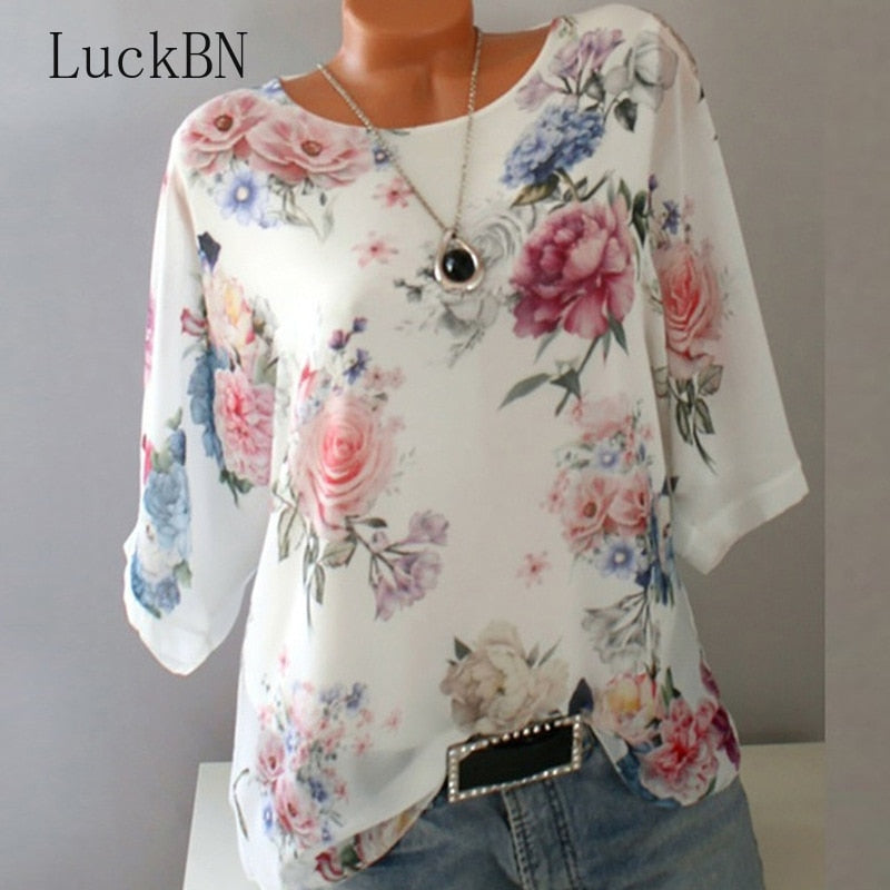 Brand Name: LuckBNMaterial: PolyesterMaterial: SpandexClothing Length: RegularCollar: O-NeckGender: WOMENDecoration: NONESleeve Length(cm): HalfSleeve Style: RegularStyle: CasualFabric Type: BroadclothPattern Type: PrintModel Number: 1976